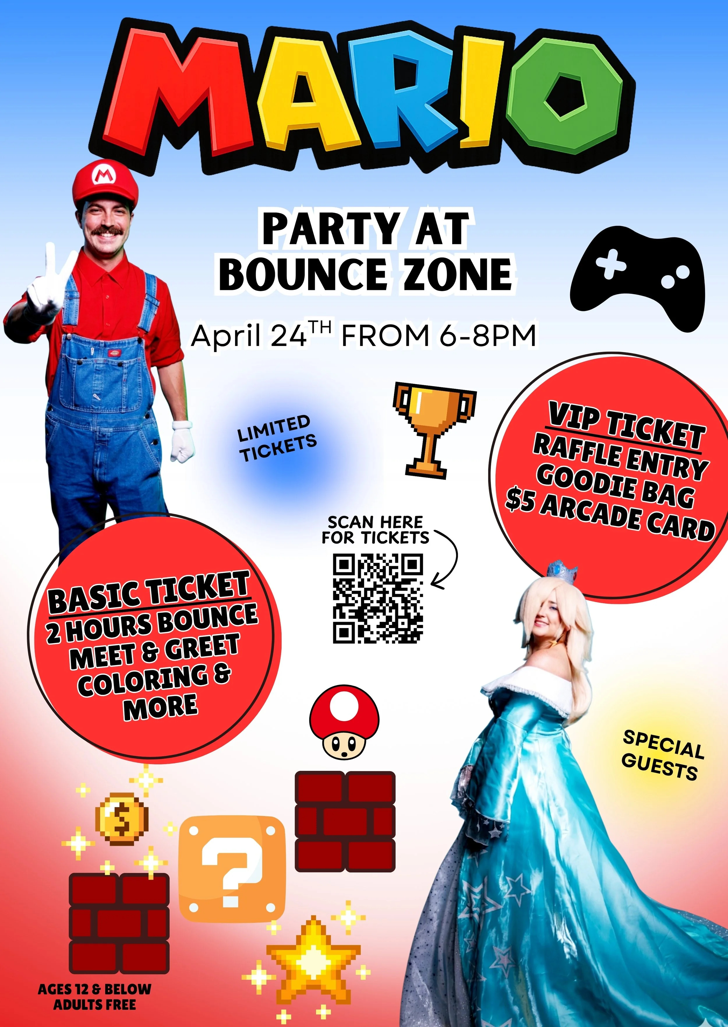 Join us for an exciting night of bouncing, games, and Mario-themed fun. Kids will enjoy two hours of open play on our inflatables, a special character meet & greet, themed activities like coloring, arcade fun, and a raffle with great prizes.