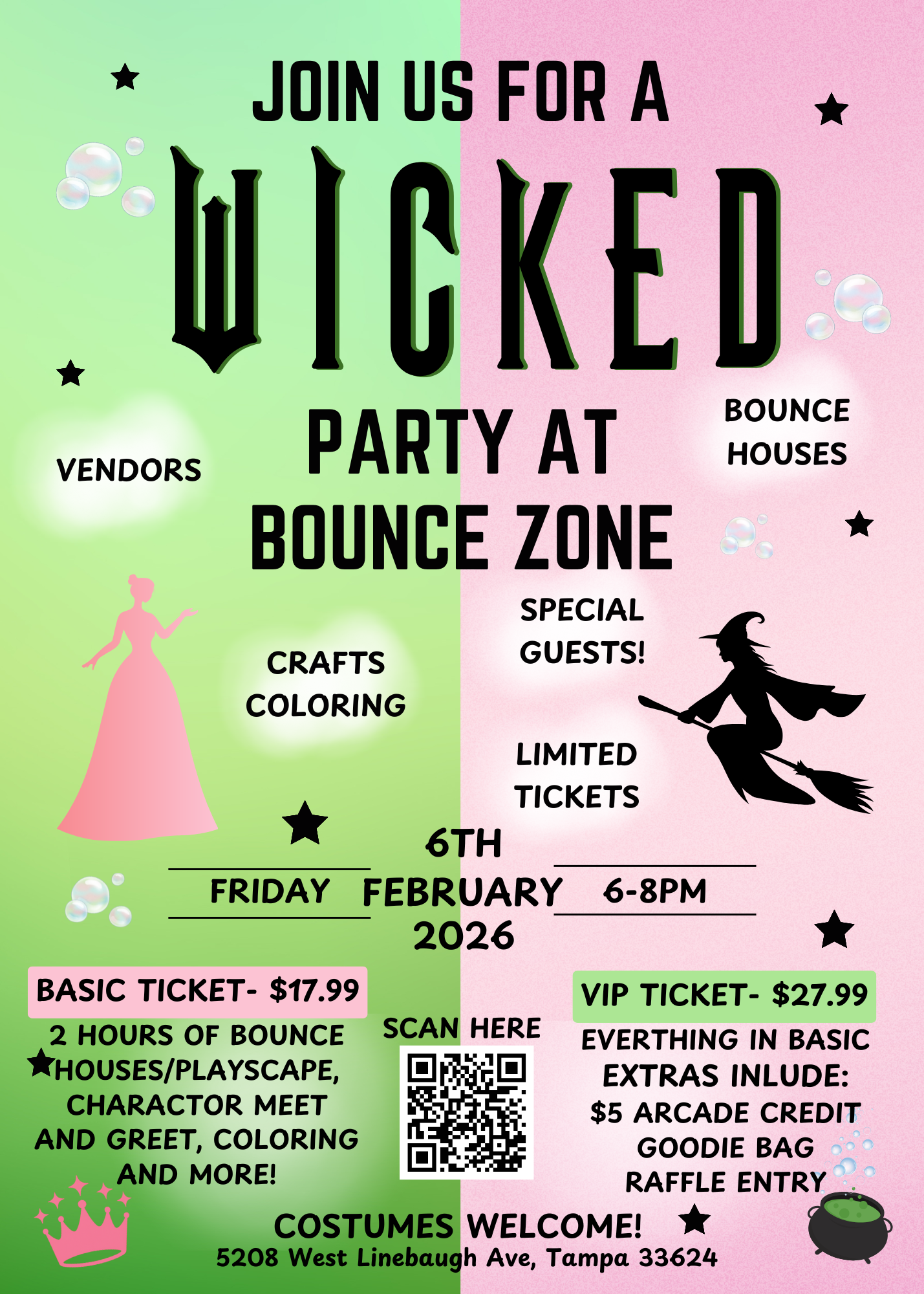 Join us for a wickedly fun day at Bounce Zone on February 6th from 6-8 PM! Galinda and Elphaba will be stopping by for a special meet & greet, along with themed crafts, bounce houses, our playscape, and multiple local vendors to explore.